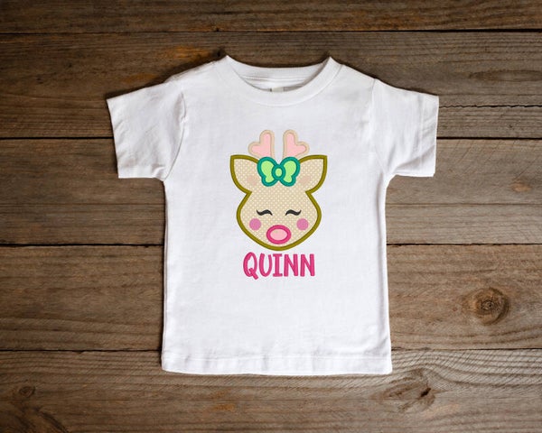 Applique design perfect for the holiday season. This design features a cute deer with a bow. Please enter the name you would like embroidered.